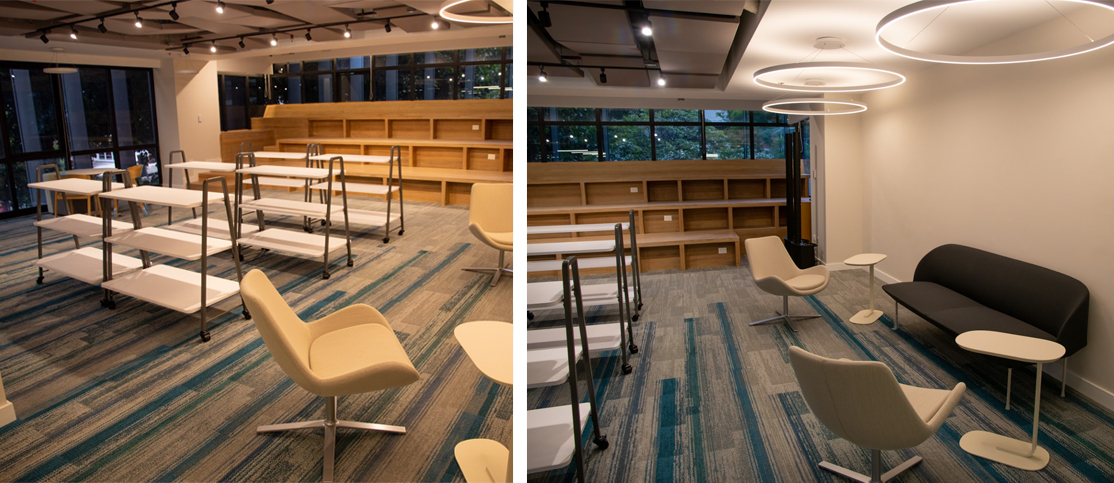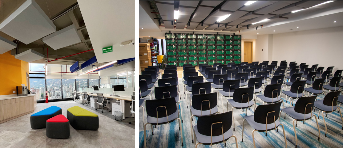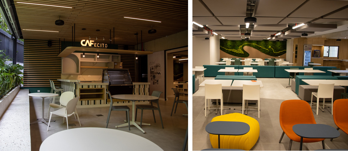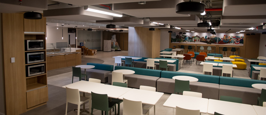 Nuestra meta fue desarrollar espacios de trabajo flexibles y colaborativos que potenciaran la productividad, la integración y la innovación, incorporando la identidad cultural. Aplicamos principios de arquitectura acústica moderna, integrando componentes físicos, visuales y de branding para diseñar entornos que comunicaran la historia, los valores y las metas institucionales de la organización Este enfoque se materializó en la ejecución del proyecto para CAF, donde llevamos a cabo la remodelación integral de un comedor corporativo de 426 m² y una mezzanina de 690 m². La intervención transformó estos espacios en ambientes funcionales, modernos y alineados con las dinámicas operativas de la institución, fortaleciendo la experiencia del usuario y consolidando la identidad organizacional a través del diseño arquitectónico.